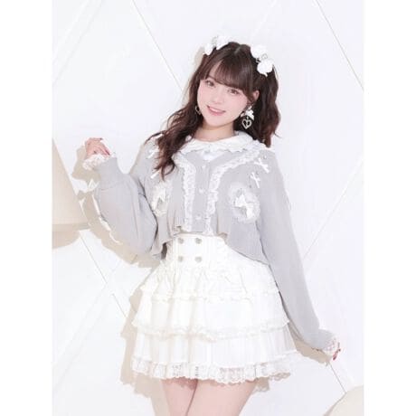 ひらりとしたレースとビジュー調を組み合わせたリボンがアクセントになるカーディガン。
