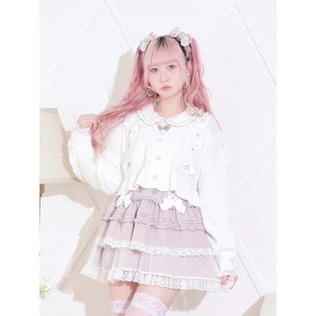ひらりとしたレースとビジュー調を組み合わせたリボンがアクセントになるカーディガン。