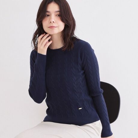 ・細すぎないケーブルの編み幅で、身体のラインを拾いにくい一枚。
