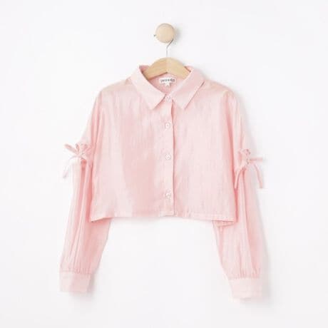 肩の部分に抜け感のあるデザインを入れた短め丈の長袖シャツです。