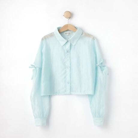 肩の部分に抜け感のあるデザインを入れた短め丈の長袖シャツです。