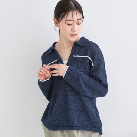 春先に一枚で着映えする、襟付きテープヤーンニット