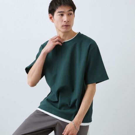1枚でレイヤードスタイルが完成する、フェイクレイヤード仕様のクルーネックTシャツ。