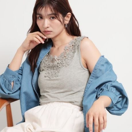 フロントから背中までモチーフレースを贅沢にあしらったタンクトップ。
