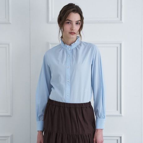 スタンドカラーの衿端にフリルをあしらったシャツ。