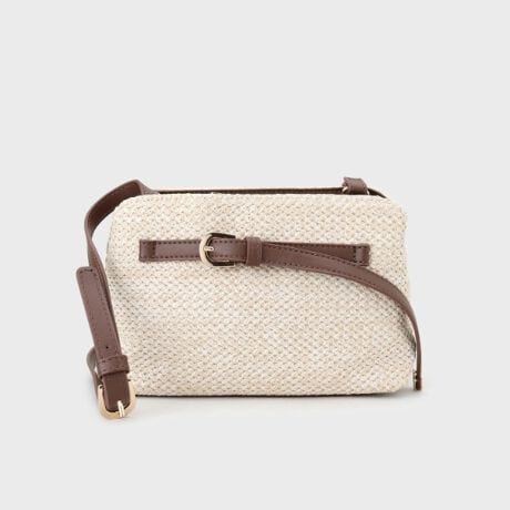 かご風の編み地に、フロントのベルトノットが効いたミニショルダー。