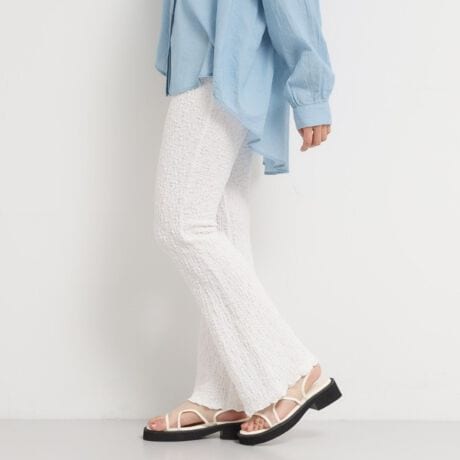 凹凸のある表面感が映える、フレアパンツ。