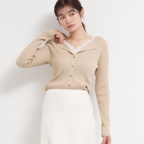 胸元にレースをあしらったレイヤード見えのリブニットプルオーバー。