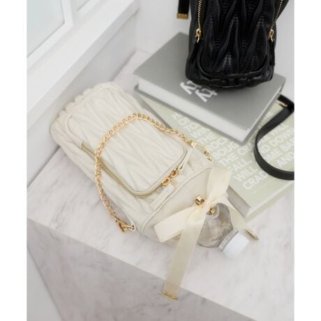 上品な質感とゴールドチェーンの組み合わせで、カジュアルすぎず大人可愛い印象に仕上げました。