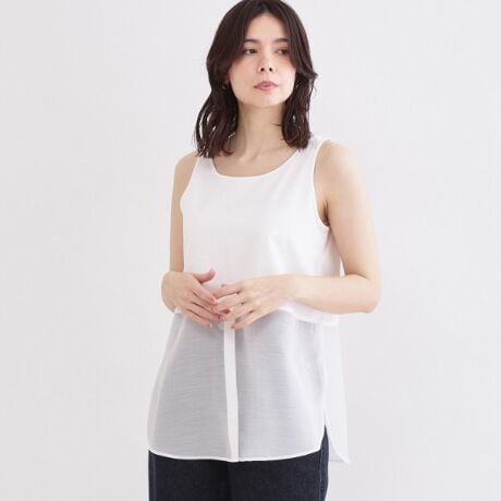 ・裾に布帛素材(001はシャツ素材、101はオーガンジー素材)がドッキングされている、重ね着用のタンクトップ。