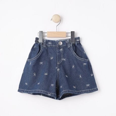 刺繍リボンが散りばめられたライトデニムのショートパンツ。