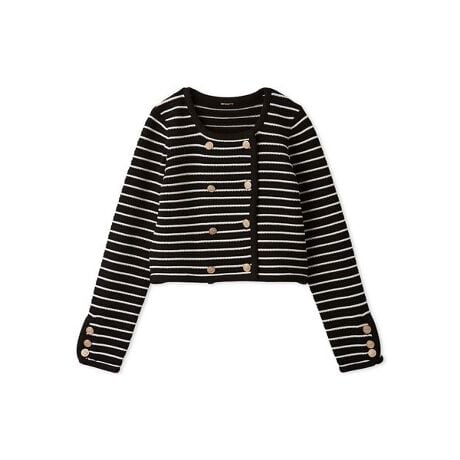 クロシェ編みのような表情のある模様編みがトレンド感のあるニットカーディガンです。ボタンを2列にすることで今季らしいマリンテイストに仕上げました。ボタンはエレガントなチェックデザインのゴールドメタルボタンをセレクト。パイピングを施し、袖口にもボタンをプラスし、ジャケット風デザインに。程よく肉厚ながらシアー感のあるコットン混のニット生地は、ドライタッチな肌触りで軽やかに羽織っていただけます。