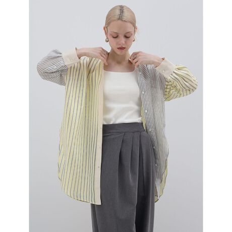 ピッチや質感の異なるストライプを組み合わせた表情豊かなデザインシャツ。奥行きと動きのある印象を生み出し、一枚で着映える仕上がりに。程よいオーバーサイズシルエットでリラクシーな着用感。透け感のある袖や切り替えが抜け感をプラスし、夏のスタイリングに軽やかさを添えてくれます。