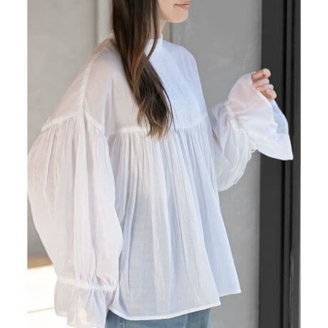 コットンボイルフリルネックピンタックブラウス