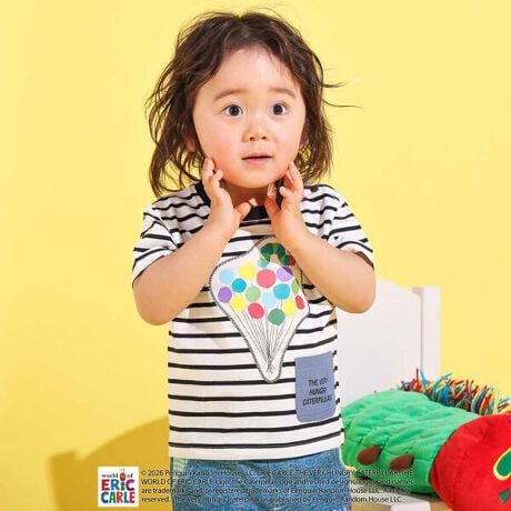 すっきりとしたボーダー柄の上を、バルーンに乗ったあおむしがふわりと漂う、どこか夢のある仕上がりに。