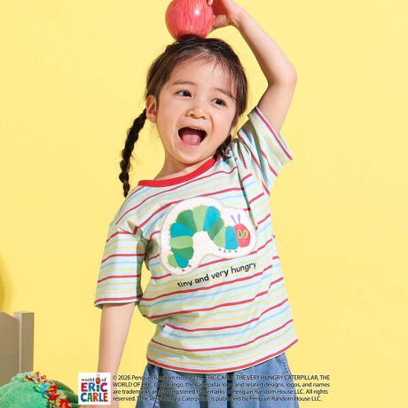 すっきりとしたボーダー柄の上を、バルーンに乗ったあおむしがふわりと漂う、どこか夢のある仕上がりに。