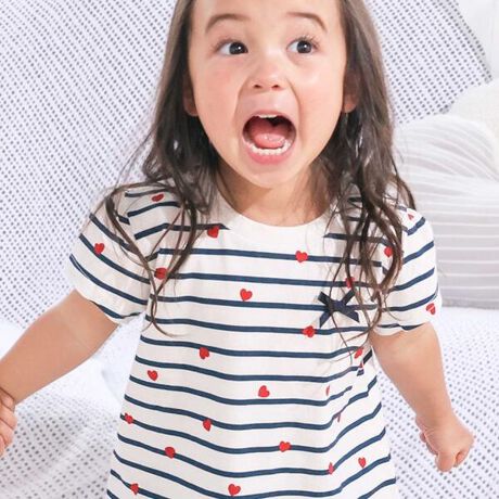 汚れが落ちやすく、のびのび遊べる素材で仕上げたスララクシリーズ!毎日が嬉しくなる女の子用半袖Tシャツ。
