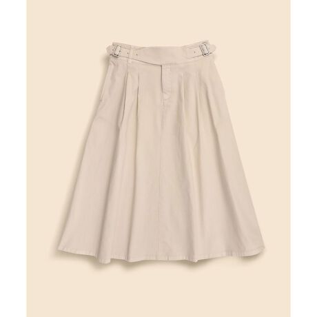 メンズの春夏アイテムで人気のグルカショーツからヒントを得たロングスカートです。ミリタリーウェア由来の実用的なディテールを、濃色にも淡色にも合わせやすい、明るいベージュ系のカラーでブラッシュアップ。Tシャツなどのカジュアルアイテムはもちろんのこと、ソフトなブラウスやコンパクトなシルエットのセーターなど、フェミニンなトップスと合わせて、コントラストの効いたスタイリングに仕上げるのもお薦めです。