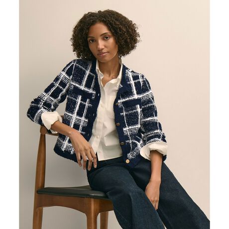 長めの毛足による柔らかな質感と、クラシカルなチェック柄が特徴のノーカラージャケット。着丈をコンパクトに設定し、現代的なシルエットにアレンジしました。スラックス等とのきれいめな着こなしはもちろん、デニムパンツを合わせたカジュアルな装いにも馴染む汎用性の高い一着です。