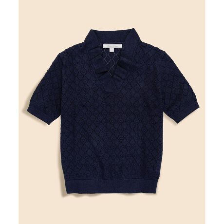 [型番:P26630100228205]繊細なポインテール編みと、襟元のラッフルが特徴的なポロセーター透かし編みの軽やかさとフェミニンなラッフルディテールを組み合わせ、レディライクな一着に仕上げました。一枚での着用はもちろん、ジャケットのインナーとしても華やかさを添える、洗練されたデザイン。甘さと上品さのバランスの取れたニットウェアです。