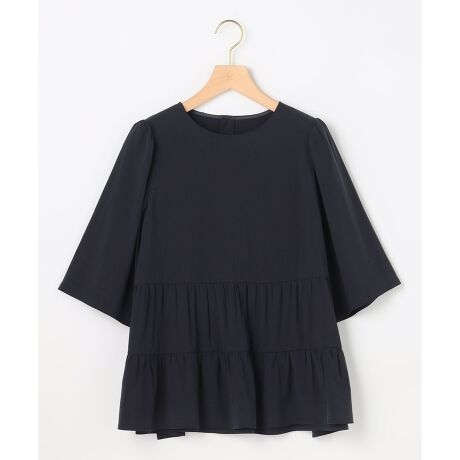 ■デザイン・ややハイウエストのギャザーティアードとセットインの5分丈パフ袖のブラウスは着映え間違いなし。・やや詰まり気味のクルーネックがカジュアル過ぎず上品に着こなせます。・後ろの開きの貝釦がアクセントです。