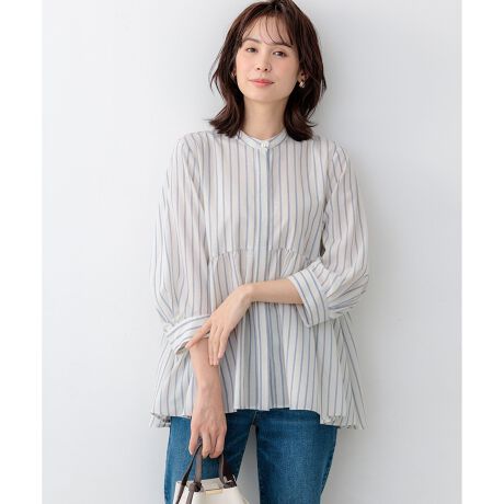 ■デザイン・ローウエストで切り替えたペプラムフレアとスリーブデザインが1枚でサマになる主役ブラウス。・おしりを隠すチュニック丈で、フィッシュテールのような裾が何ともチャーミング。・甘くなりすぎないように全体のシルエットやバンドカラーの形状など『締め』ポイントをつくり大人の甘さを表現。・シンプルなパンツやデニムと合わせるだけで気の利いたコーディネートにしてくれます。