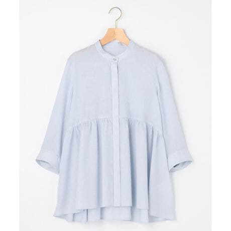 ■デザイン・ローウエストで切り替えたペプラムフレアとスリーブデザインが1枚でサマになる主役ブラウス。・おしりを隠すチュニック丈で、フィッシュテールのような裾が何ともチャーミング。・甘くなりすぎないように全体のシルエットやバンドカラーの形状など『締め』ポイントをつくり大人の甘さを表現。・シンプルなパンツやデニムと合わせるだけで気の利いたコーディネートにしてくれます。