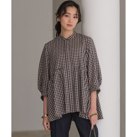 ■デザイン・ローウエストで切り替えたペプラムフレアとスリーブデザインが1枚でサマになる主役ブラウス。・おしりを隠すチュニック丈で、フィッシュテールのような裾が何ともチャーミング。・甘くなりすぎないように全体のシルエットやバンドカラーの形状など『締め』ポイントをつくり大人の甘さを表現。・シンプルなパンツやデニムと合わせるだけで気の利いたコーディネートにしてくれます。