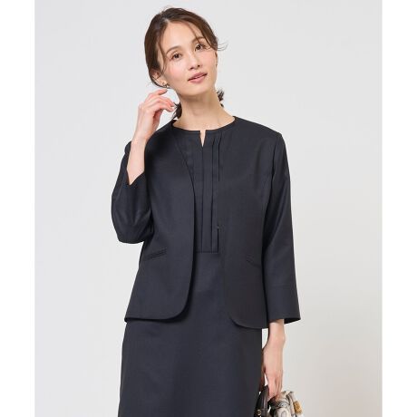 ■デザイン羽織感覚でさらりと着られる、軽やかなノーカラージャケット。フロントはホック1つで留めるミニマルなデザインにし、シャープなVネックがデコルテラインをすっきりと見せてくれます。バックスタイルはウエスト部分に切り替えを入れ、シンプルながらもメリハリのあるシルエットに仕上げました。8分袖でリターンできる設定にしており、手首まわりを見せて抜け感のある軽やかな雰囲気に。裏なしです。