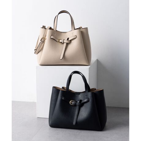 ■デザイン・素材・シンプルながらもアクセントになるベルトが、上品でモダンな印象を演出します。・2WAY仕様で、取り外し可能なショルダーストラップ付き。・ハンドバッグとしてもショルダーバッグとしても使えるので、シーンやスタイルに合わせて自由に持ち方を変えられます。・コンパクトな見た目ながら収納力に優れ、内側は仕切り付きでバッグの中の荷物の整理も快適です。・オフィスカジュアルなスタイリングや、デイリーなお出かけにぴったりのバッグです。