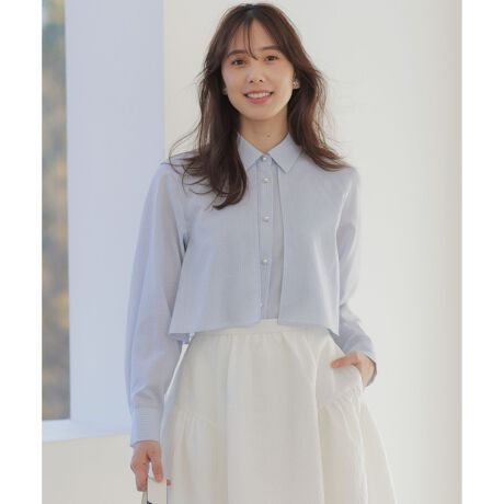 ■デザイン・ベーシックなシャツと短丈シャツを重ねたような、長めのデザインヨークがポイントのシャツ。・ボトムにインしてヨーク部分だけ出すと短丈トップスとしても楽しめます。・丈感をアレンジして全身バランスが調整可能なブラウスです。・前を開けて羽織にも。ライトアウターとしても重宝してくれます。・全体的にやや辛口なディテールなので、パール釦で甘さと女性らしさをプラス。横から見たフレアシルエットもこだわりました。・全体のシルエットや襟や袖の形状など、少しだけ柔らかさのある要素を取り入れています。・スカートやパンツと合わせるだけで気の利いたコーディネートに。・スタイリングによって綺麗めからカジュアルまで雰囲気をかえられる万能ブラウスです。