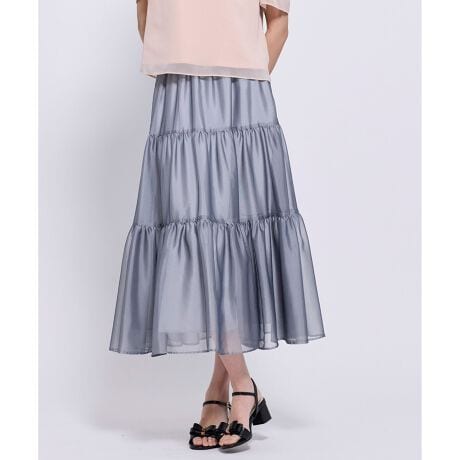 軽やかな素材感が魅力のティアードデザインスカート。カラーは。グレーと淡いブルーの2色展開。切り替え部分にたっぷりとギャザーを入れ、動くたびにふんわりと揺れる女性らしいシルエットに仕上げています。