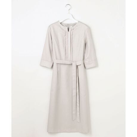 ■デザインフィット&フレアーのシルエットで、女性らしさを引き立てるきれいめワンピース。フロント部分にはタックを施すことで、立体感のある洗練された表情をプラスしました。気になる二の腕を上品にカバーする6分袖の袖口に、異素材のグログランテープを挟み込み、さりげないアクセントを効かせています。 ジャケットを羽織ってももたつかずすっきりと決まるため、毎日の通勤スタイルにも最適です。付属の共布リボンでウエストマークすれば、よりメリハリのあるフェミニンな印象にアレンジ可能。膝が隠れる安心の丈感で、幅広いシーンで上品に着こなせる1枚です。身頃のみ裏付きです。
