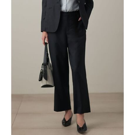 ■デザイン程よいゆとりを持たせたストレートシルエットで、脚のラインをすっきりと見せるきれいめパンツ。 腰回りはすっきりとさせつつ、後ろウエストにはゴムを施すことで、締め付け感の少ない快適な穿き心地を叶えました。シンプルでベーシックなデザインだからこそ際立つ上質感があり、大人の女性のビジネススタイルを格上げしてくれます。総裏ありです。