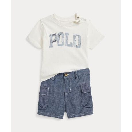 シャンブレーのカーゴショートパンツとジャージーTシャツを組み合わせたコットンセット。インディゴカラーのパッチワークアップリケで表現したPoloのロゴが特徴。・Tシャツ:クルーネック / 3〜12カ月サイズは、左肩に2つスナップのプラケット / 半袖 / フロント中央にPoloの文字のアップリケ・ショートパンツ:ベルトループ / ウエスト背面に伸縮素材 / 3〜6カ月サイズはフライなし / 9〜24カ月サイズはジップフライ / フロント中央にボタン留め / 両方の太ももにカーゴポケット・生地や布張りの室内装飾品に色移りすることがあります。 【素材】・上 本体:綿 100% 装飾部分を除く パンツ 本体:綿 100%【生産国】インド