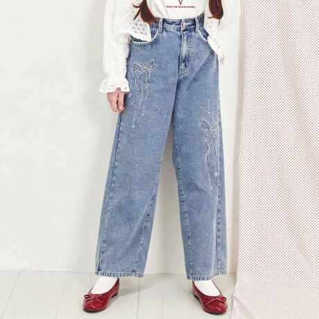 【接触冷感】リボン刺しゅうが動くたびにきらっと輝くラインストーンが目を引く、ガーリー感たっぷりのデニムパンツ。