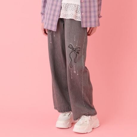 【接触冷感】リボン刺しゅうが動くたびにきらっと輝くラインストーンが目を引く、ガーリー感たっぷりのデニムパンツ。