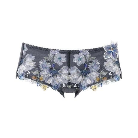 ●やわらかいはきごこち バックはやわらかく伸びるベア天竺素材で、はきごこちがよい・フロントは裏打ち付きで透けにくい・はきこみ丈:あさめ(ローライズ)フロントのレースには繊細に輝くラメ糸を散りばめた、華やかなアップリケがポイントの優雅で贅沢なショーツ。裾の刺繍が豪華なデザインに仕上げました。ボーイレングスショーツはすっきりと着こなしたい時におすすめ。ローライズのボトムなどとコーディネイトしやすいのもポイントです。※お洗濯は、必ず「取扱い表示」にしたがってください。