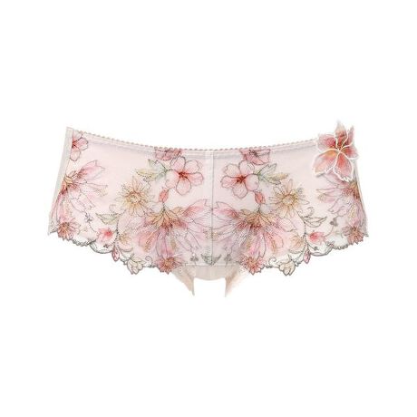 ●やわらかいはきごこち バックはやわらかく伸びるベア天竺素材で、はきごこちがよい・フロントは裏打ち付きで透けにくい・はきこみ丈:あさめ(ローライズ)フロントのレースには繊細に輝くラメ糸を散りばめた、華やかなアップリケがポイントの優雅で贅沢なショーツ。裾の刺繍が豪華なデザインに仕上げました。ボーイレングスショーツはすっきりと着こなしたい時におすすめ。ローライズのボトムなどとコーディネイトしやすいのもポイントです。※お洗濯は、必ず「取扱い表示」にしたがってください。