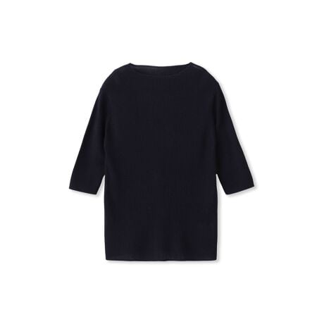 低めのハイネックですっきりとしたセットインスリーブ、長めの半袖が特徴のリブプルオーバー。