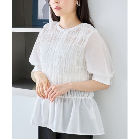 身頃全体に施したシャーリングデザインが印象的なブラウス。