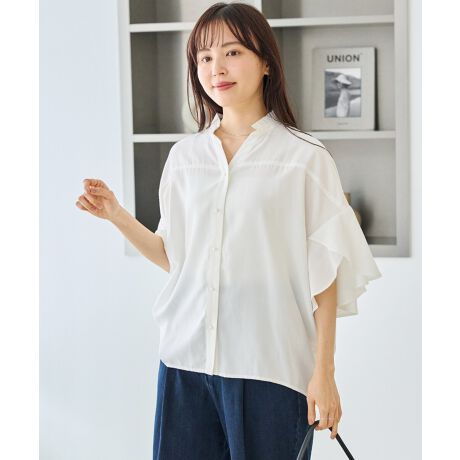軽やかに揺れるフレアスリーブと、さりげない甘さを添えるフリル衿が印象的なスキッパーブラウス。
