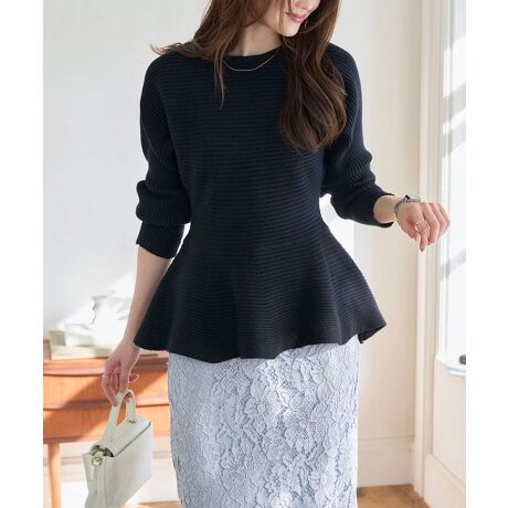 ドルマンニットのウエストが絞られ、ふんわり広がったぺプラムシルエットの春ニット。