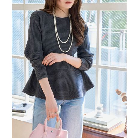 ドルマンニットのウエストが絞られ、ふんわり広がったぺプラムシルエットの春ニット。