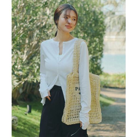 カーディガンは腰回りが隠れるくらいの着丈でさらっとラフに羽織れるデザイン。