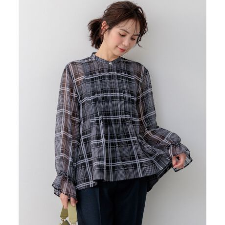 ■デザイン・繊細なピンタックが生み出す贅沢な立体感が魅力。・大胆なディテールによりモード感もプラスされ甘くなりすぎず、大人の遊び心を感じさせます。・ふんわり広がるシルエットで体型カバーをしてくれつつ、素材のシアー感が、軽やかさと着ぶくれせずすっきりとした印象をつくります。・透け感を気にさせない全体の分量感もポイントです。・カジュアルの中にも女性らしさが見え隠れする、1枚でサマになる大人の映えブラウスです。・スタイリングの主役アイテムとして、キレイめな合わせはもちろん、カジュアルな着こなしも素敵です。