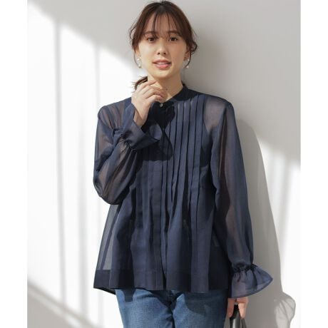 ■デザイン・繊細なピンタックが生み出す贅沢な立体感が魅力。・大胆なディテールによりモード感もプラスされ甘くなりすぎず、大人の遊び心を感じさせます。・ふんわり広がるシルエットで体型カバーをしてくれつつ、素材のシアー感が、軽やかさと着ぶくれせずすっきりとした印象をつくります。・透け感を気にさせない全体の分量感もポイントです。・カジュアルの中にも女性らしさが見え隠れする、1枚でサマになる大人の映えブラウスです。・スタイリングの主役アイテムとして、キレイめな合わせはもちろん、カジュアルな着こなしも素敵です。
