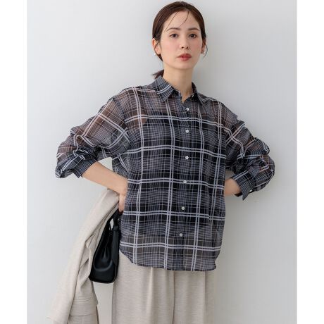 ■デザイン・.適度に体から離れたシルエットと胸のパッチポケットがアクセント。・ベーシックなシアーシャツブラウスは羽織りにも使え着用シーズンが長いのも魅力です。・貝ボタン使いが高級感を演出してくれます。