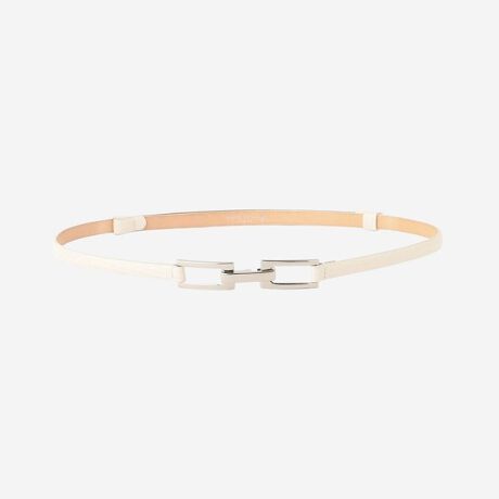 スクエアの形状のビット金具がポイントの10mm巾の細ベルトです。白(#03)、ベージュ(#40)、グリーン(#70)は艶とカラーの美しいリザード型押レザーを使用しております。黒(#09)にはマットで落ち着きのあるサフィアーノ型押レザーを使用しています。いずれも型押で傷が付いても目立ちにくくなっています。金具のフックをもう一方の角カンにひっかけて着用できます。背後のレザーをスライドさせて自由にサイズ調節出来るアジャストベルトで、ワンピース、スカート、パンツやアウター、ストールの上からなど様々なスタイルに合わせやすくなっています。