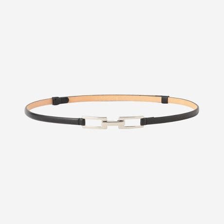スクエアの形状のビット金具がポイントの10mm巾の細ベルトです。白(#03)、ベージュ(#40)、グリーン(#70)は艶とカラーの美しいリザード型押レザーを使用しております。黒(#09)にはマットで落ち着きのあるサフィアーノ型押レザーを使用しています。いずれも型押で傷が付いても目立ちにくくなっています。金具のフックをもう一方の角カンにひっかけて着用できます。背後のレザーをスライドさせて自由にサイズ調節出来るアジャストベルトで、ワンピース、スカート、パンツやアウター、ストールの上からなど様々なスタイルに合わせやすくなっています。